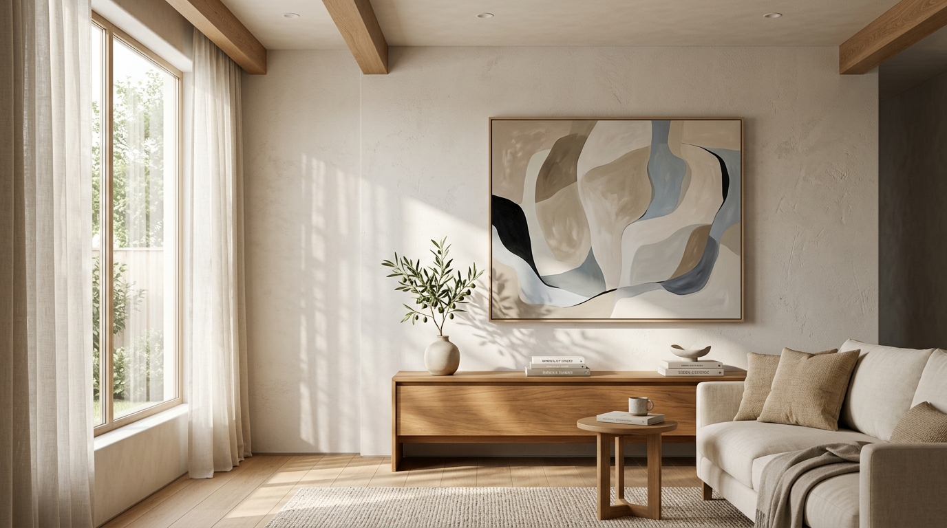 Xu hướng sử dụng kích thước tranh treo tường khổ lớn đang ngày càng bùng nổ, đặc biệt thịnh hành trong các không gian mang phong cách Hiện đại, Tối giản (Minimalism), Bắc Âu (Scandinavian) hay Wabi-Sabi. Một bức tranh khổ lớn (như 100x150cm, 120x180cm, hoặc thậm chí lớn hơn) không chỉ lấp đầy khoảng trống mà còn mang lại sự ấn tượng mạnh mẽ (statement piece), định hình rõ nét cá tính độc tôn của gia chủ.