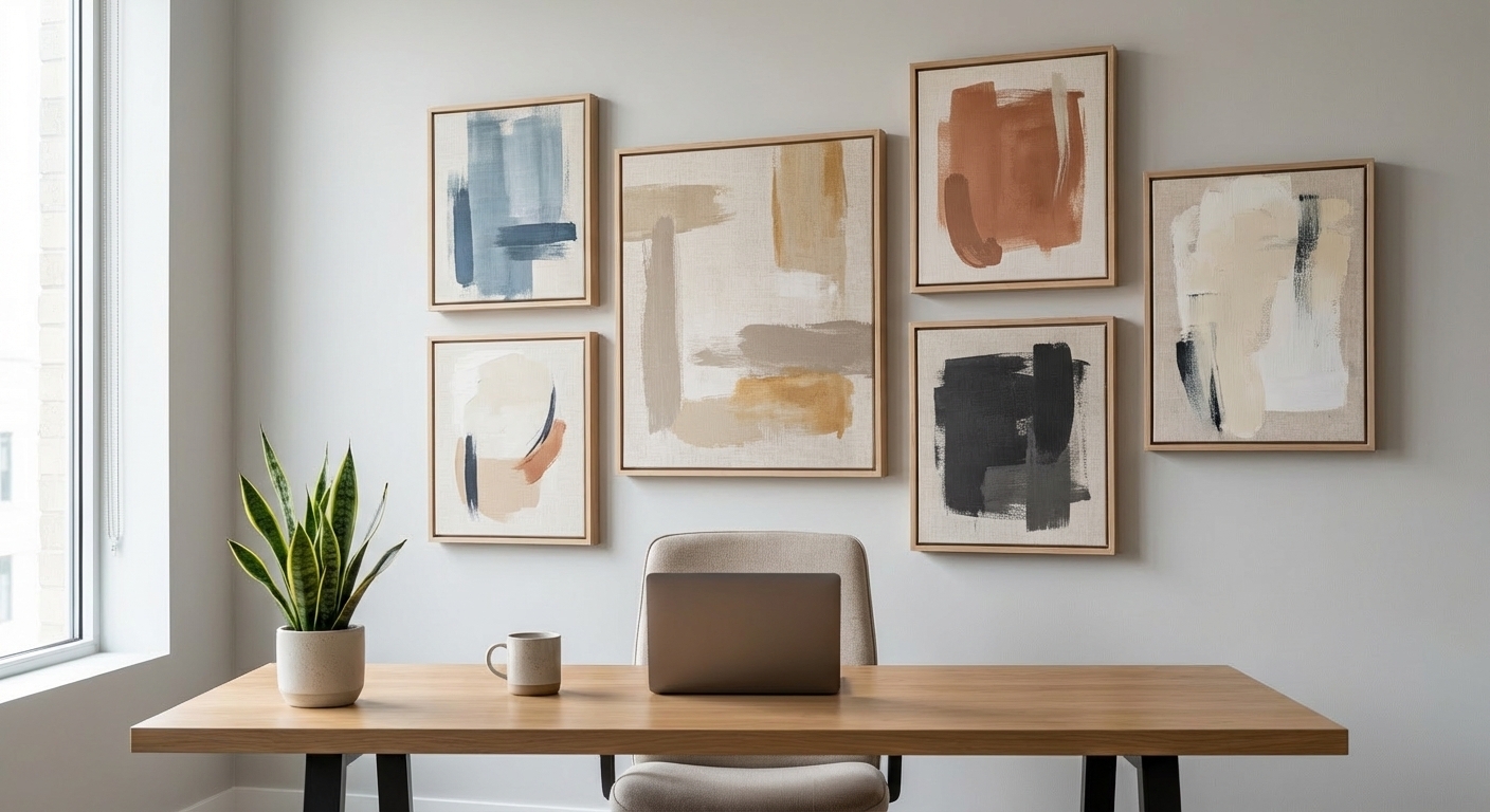 - Màu sắc: Nguyên tắc chọn màu là "Tương đồng hoặc Tương phản". Nếu phòng khách của bạn có tông màu trung tính (be, xám), một bức tranh với màu sắc rực rỡ, đường nét sắc sảo sẽ là điểm nhấn hoàn hảo. Ngược lại, tại văn phòng, các gam màu lạnh như xanh dương, xanh lá sẽ giúp giảm căng thẳng và tăng sự tập trung.