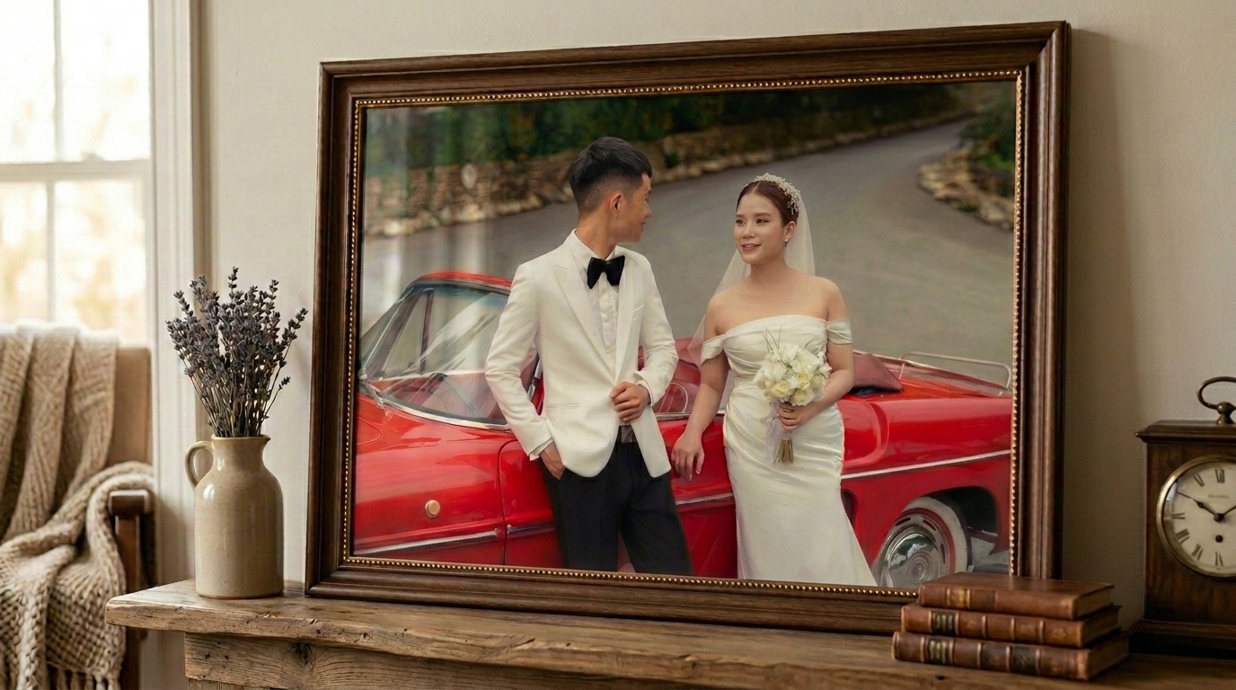 Nhà Có Tranh cung cấp dịch vụ phục chế ảnh, thiết kế lại ảnh cưới theo phong cách nghệ thuật, thêm text (ngày tháng kỷ niệm, tên vợ chồng) và in trên nền canvas cao cấp với mực in UV bền màu trên 10 năm.